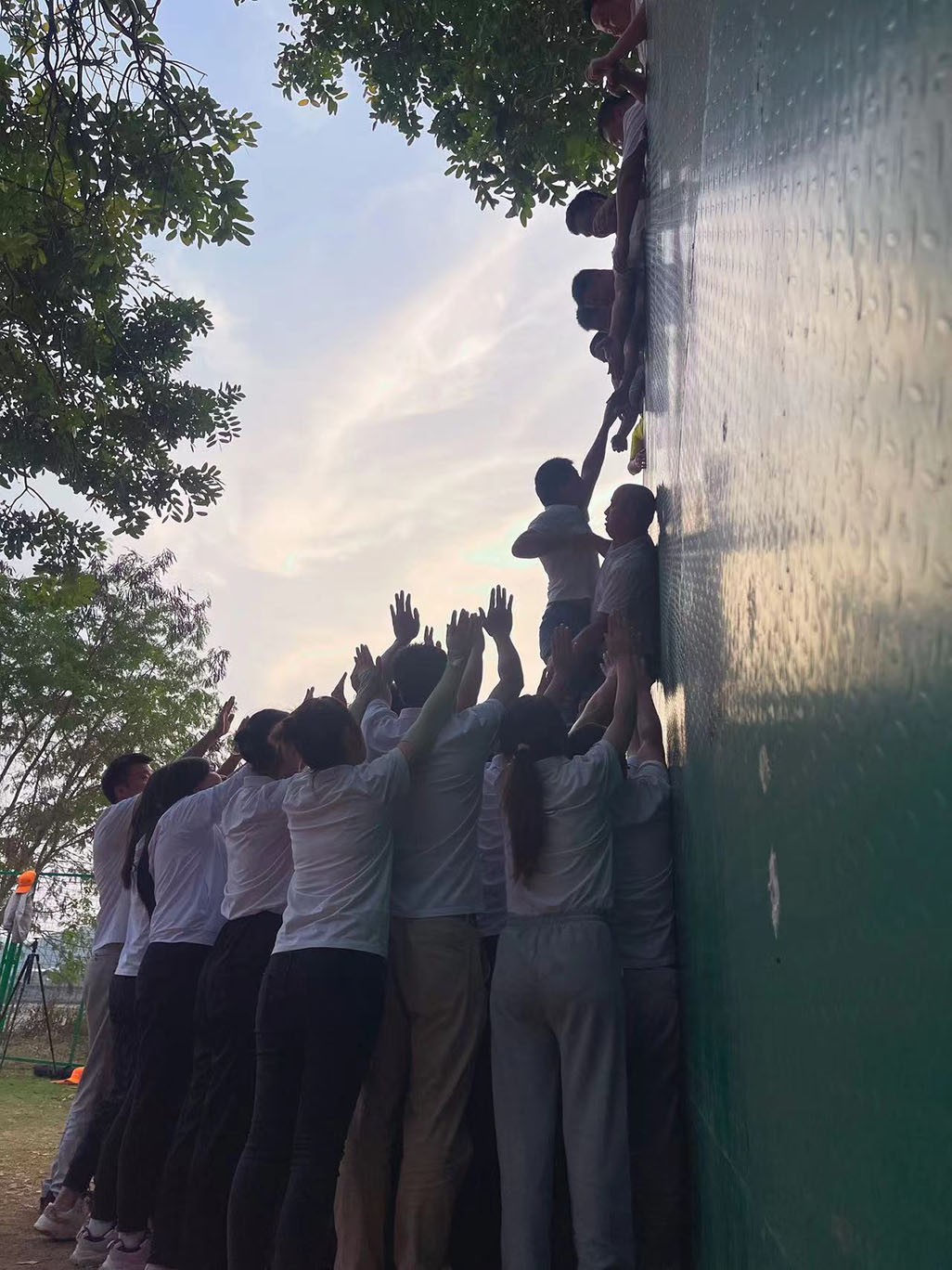 经过午间的休息和调整之后,大家在领队的号召下继续拓展活动,组员拼接塑料管片让弹珠一路滚动直到落入前方指定纸杯中(珠行万里),分组协作按照任务卡和图形卡拼七巧板(战国七雄),徒手翻越四米高墙(毕业墙),活动现场气氛紧张,过程中大家虽屡屡受挫,却空前团结,加油声响亮,最终取得任务成功!