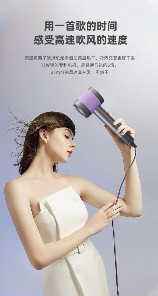 高速负离子吹风机无需借助高温烘干,冷热交替更好干发;11W转的专利电机,强劲动能,是普通马达的6倍,大大地缩短了吹发时间,短发吹干仅需1-3分钟,齐肩款中长发吹干仅需3-5分钟,及腰款长发和卷发吹干也只要5-8分钟;21m/s的风速真护发,锁住头发发芯健康含水量,还原头发强韧、光泽、顺滑形象,给予不一样的干发体验。