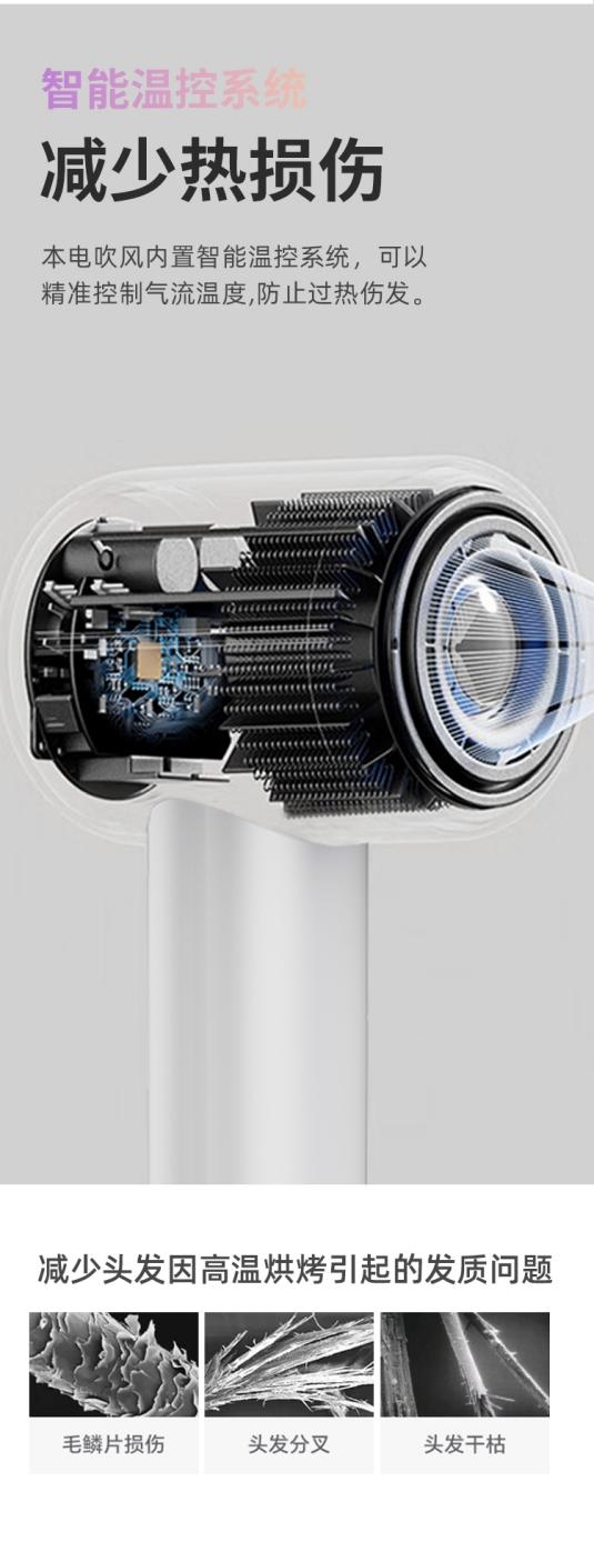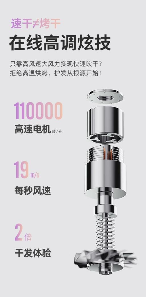 同时,高速吹风机通过电子芯片的智能控制,可以实现精细的风速调节,每分钟能输出 19m/s 以上的大风量,快速将头发吹干,缩短使用时间,1分钟即可吹干利落短发,长发也仅需5分钟,高效速干。
