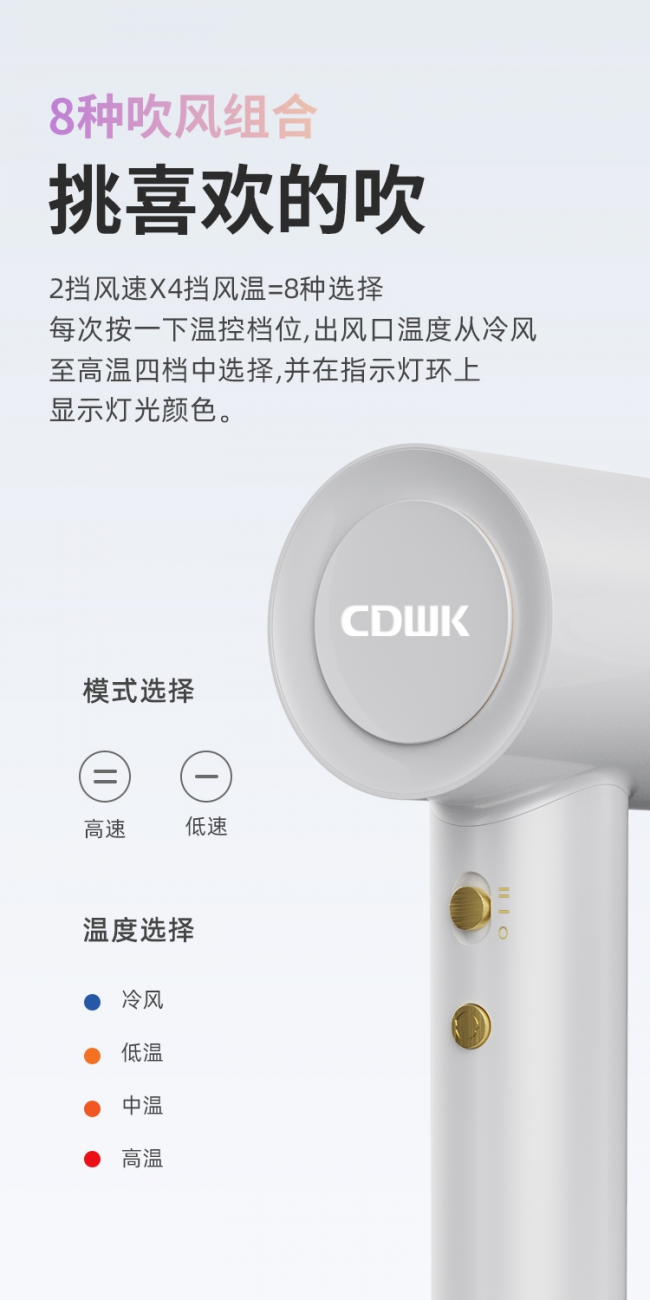 CDWK必威betway官方近期推出的新生代高速吹风机,配备强劲的风力,高效将水分从头发中吹干,使人们从此告别繁琐低效的吹头发环节。