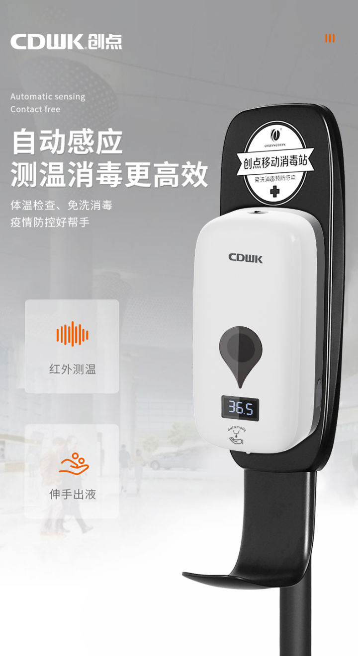 其移动消毒站专为解决公共场所健康监测、清洁消毒难题而来。整体外形基于简约美学而开发,黑白干净的配色,让整体机身给使用者带来更加清爽整洁的视觉感受,更加融合了它极简的设计理念。产品设置了红外线传感器,用户把手放置感应区域,皂液器就可自动出泡,降低了可能传播细菌和病毒的风险,卫生又干净,打造看得见的安全感,同时能有效控制浪费现象,实现便捷测温,满足酒店业高效、便捷、节能的卫生清洁需求。